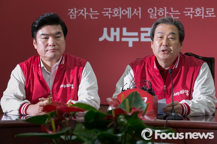 (서울=포커스뉴스) 김무성(오른쪽) 새누리당 대표가 7일 오전 서울 여의도 당사에서 열린 공동선대위원장 긴급회의에 참석해, 모두발언하고 있다.