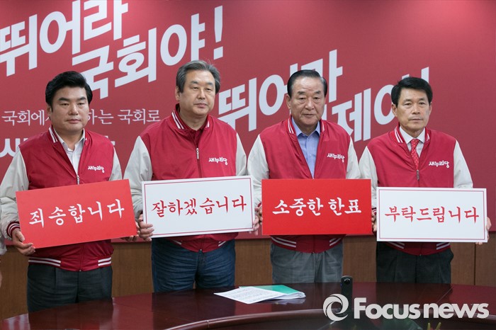 (서울=포커스뉴스) 7일 오전 서울 여의도 새누리당사에서 새누리당 지도부가 공동선대위원장 긴급회의에 참석해, 투표독려 홍보문구를 들고 있다. 왼쪽부터 원유철 원내대표, 김무성 대표, 서청원 최고위원, 이군현 공동총괄본부장.