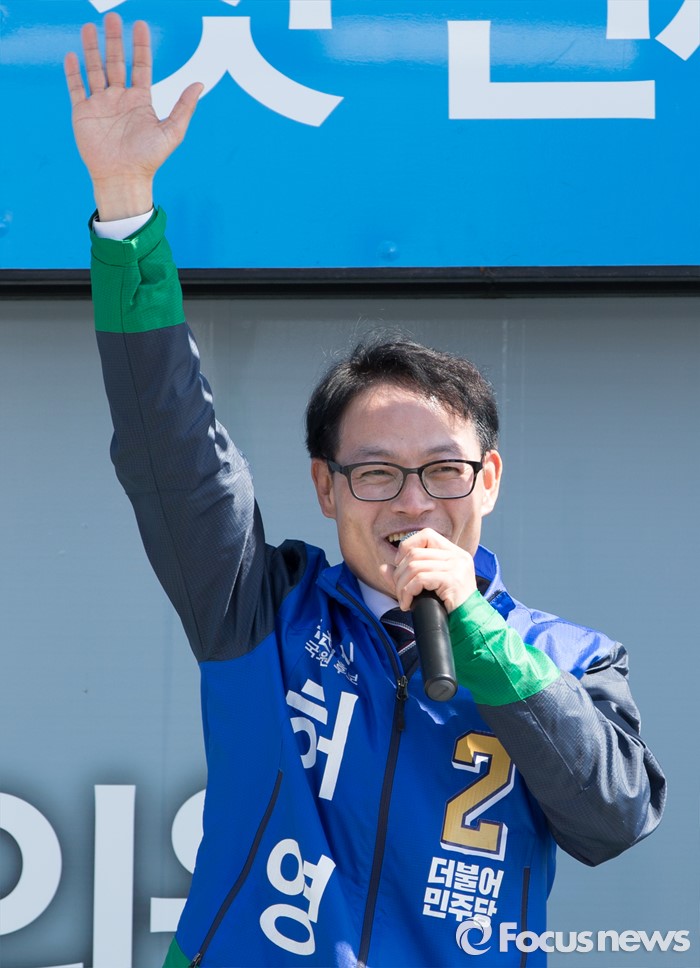 (춘천=포커스뉴스) 7일 강원도 춘천풍물시장 인근에서 김종인 더불어민주당 비대위 대표와 허영 더불어민주당 춘천 후보가 유권자들에게 지지를 호소하고 있다.