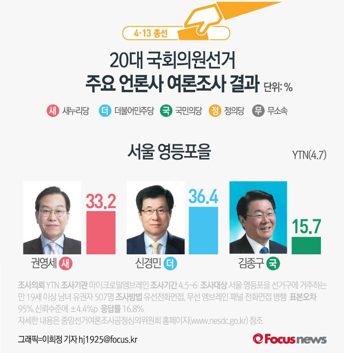(서울=포커스뉴스) 4·13 총선이 얼마 남지 않았습니다. 총선 여론조사 결과 마지막 공표일인 오늘도 각 지역구별로 엎치락 뒤치락 하는 판세인데요. 각 언론사에서 실시한 주요 지역구 여론조사 결과를 살펴 보시죠. 이번에 보실 지역은 서울특별시 선거구입니다.