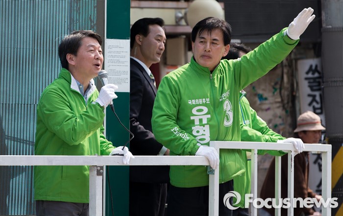 (하남=포커스뉴스) 7일 오후 경기 하남 신장시장 앞에서 안철수 국민의당 상임공동대표가 유형욱 국민의당 하남시 후보 지원유세를 하고 있다.