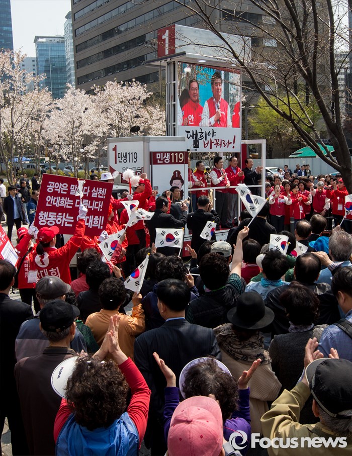 (서울=포커스뉴스) 7일 오후 서울 마포구 늘장공원에서 열린 안대희 새누리당 마포갑 후보 집중유세에 참석한 김무성 대표와 안 후보, 서청원 최고위원, 원유철 원내대표가 유권자들의 지지를 호소하고 있다.