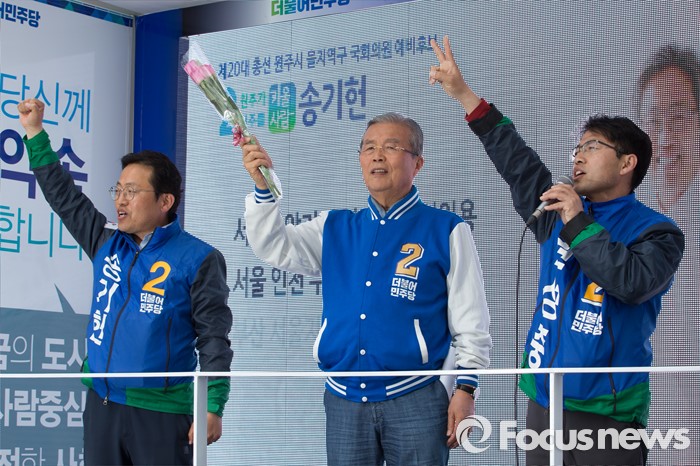 (원주=포커스뉴스) 7일 오후 강원도 원주중앙시장 인근에서 송기헌 더불어민주당 원주을 후보, 김종인 더불어민주당 비대위 대표, 권성중 더불어민주당 원주갑 후보가 유권자들에게 지지를 호소하고 있다.
