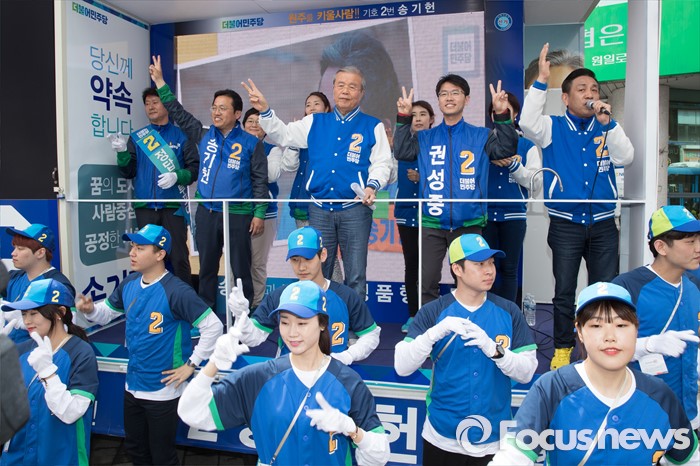 (원주=포커스뉴스) 7일 오후 강원도 원주중앙시장 인근에서 송기헌 더불어민주당 원주을 후보, 김종인 더불어민주당 비대위 대표, 권성중 더불어민주당 원주갑 후보가 유권자들에게 지지를 호소하고 있다.