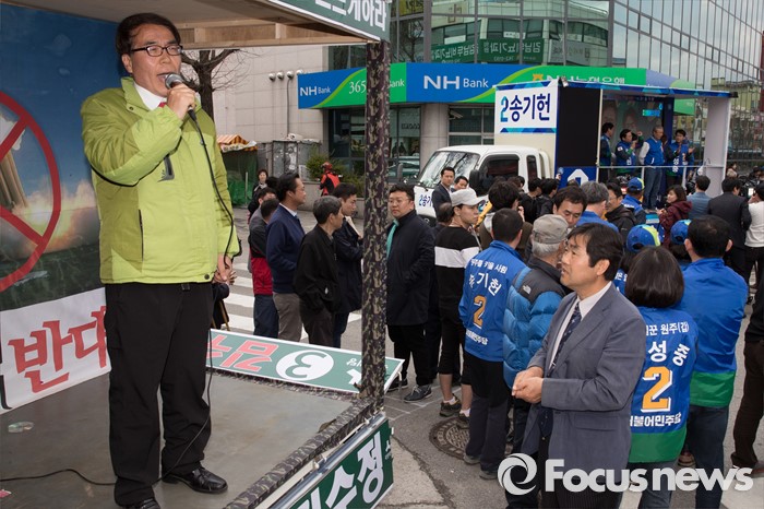 (원주=포커스뉴스) 7일 오후 강원도 원주중앙시장 인근에서 송기헌 더불어민주당 원주을 후보, 김종인 더불어민주당 비대위 대표, 권성중 더불어민주당 원주갑 후보가 유권자들에게 지지를 호소하고 있다.