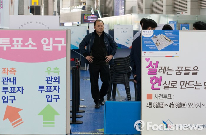 (인천공항=포커스뉴스) 제20대 국회의원 선거 사전투표를 하루 앞둔 7일 오후 인천국제공항 출국장에서 인천 선거관리위원회 관계자들이 사전투표소를 설치하고 있다.