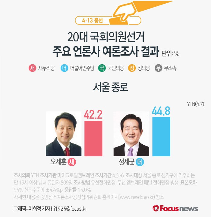 (서울=포커스뉴스) YTN이 마이크로밀엠브레인에 의뢰해 7일 발표한 서울 종로 여론조사 결과에 따르면 새누리당 오세훈 후보의 지지율은 42.2%, 더불어민주당 정세균 후보의 지지율은 44.8%로 나타났다.