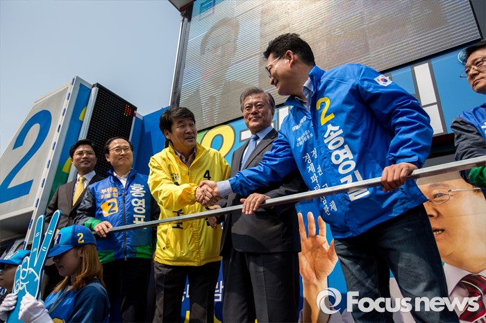 (인천=포커스뉴스) 송영길 더불어민주당 인천광역시 계양구을 후보와 김성진 정의당 인천광역시 남구을 후보가 7일 오후 인천광역시 지하철1호선 주안역 남광장에서 합동유세에 앞서 악수 하고 있다.