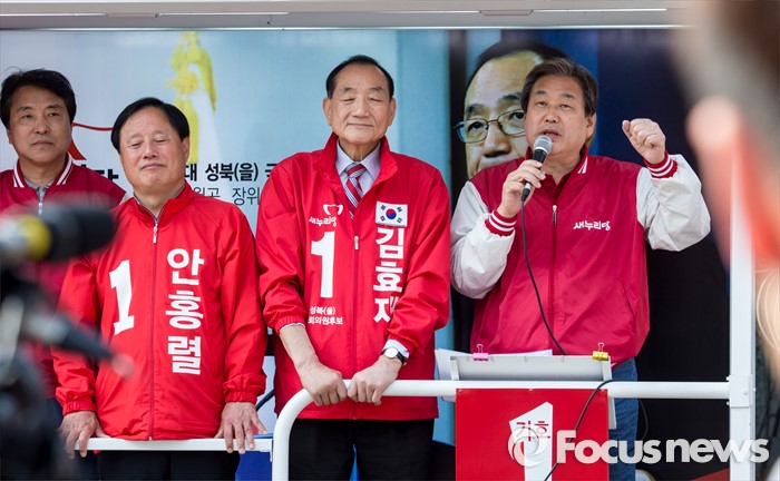 (서울=포커스뉴스) 7일 오후 서울 성북구 장위시장 앞에서 열린 김효재 새누리당 성북구을 후보 지원유세에 나선 김무성 대표가 유권자들의 지지를 호소하고 있다.