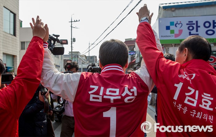 (서울=포커스뉴스) 7일 오후 서울 성북구 장위시장 앞에서 열린 김효재 새누리당 성북구을 후보 지원유세에 나선 김무성 대표가 유권자들의 지지를 호소하고 있다.