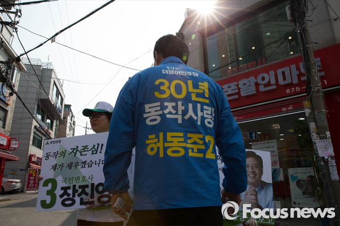 (서울=포커스뉴스) 20대 총선을 6일 앞둔 7일 오후 서울 동작구 남성역 골목시장에서 허동준 더불어민주당 동작구을 후보가 선거운동을 하고 있다.