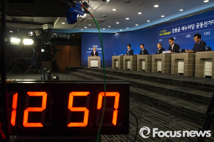 (서울=포커스뉴스) 7일 오후 서울 종로구 세종문화회관에서 열린 한국방송기자클럽 초청토론회에 참석한 강봉균(왼쪽 네번째) 새누리당 공동선거대책위원장이 패널들과 토론 시작을 기다리고 있다.