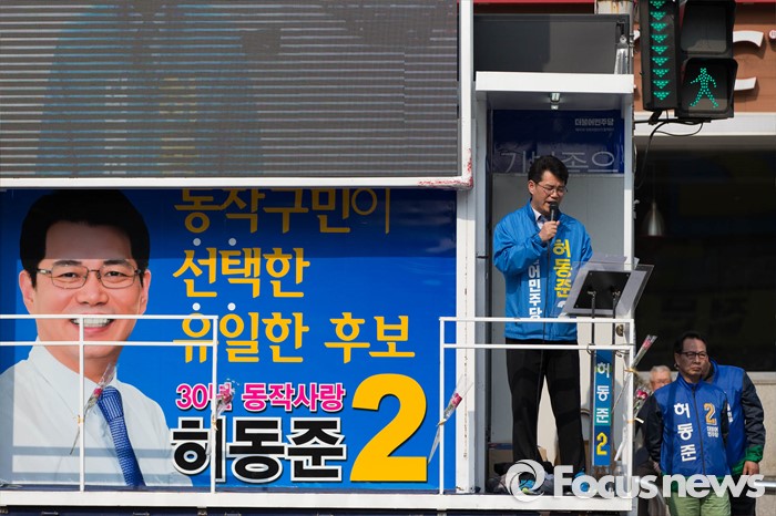 (서울=포커스뉴스) 20대 총선을 6일 앞둔 7일 오후 서울 동작구 남성역 골목시장 인근에서 허동준 더불어민주당 동작구을 후보가 선거유세를 하고 있다.