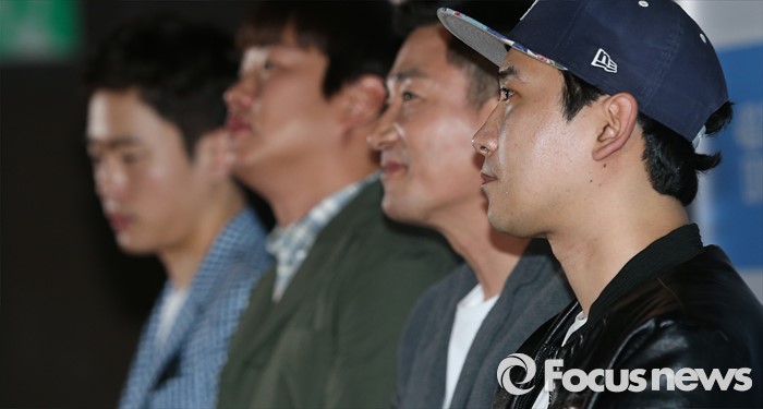 (서울=포커스뉴스) 7일 오후 서울 광진구 건대입구 롯데시네마에서 열린 영화 '위대한 소원' 언론시사회에 참석한 영화감독 남대중이 취재진에게 질문을 받고 있다. 왼쪽부터 배우 김동영, 안재홍, 전노민, 남대중 감독.