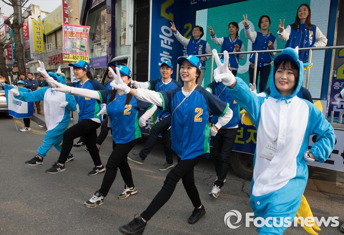 (충주=포커스뉴스) 7일 오후 충북 충주 중앙로에서 김종민 더불어민주당 대표가 지원유세를 나온 가운데 선거운동원들이 율동을 선보이며 지지를 호소하고 있다.