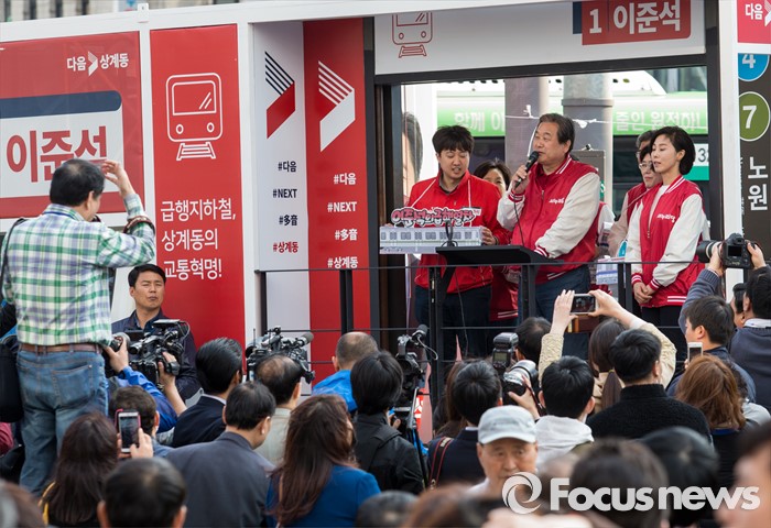 (서울=포커스뉴스) 7일 오후 서울 노원구 롯데백화점 인근에서 이준석 새누리당 노원구병 후보 지원유세에 나선 김무성 대표가 유권자들의 지지를 호소하고 있다.