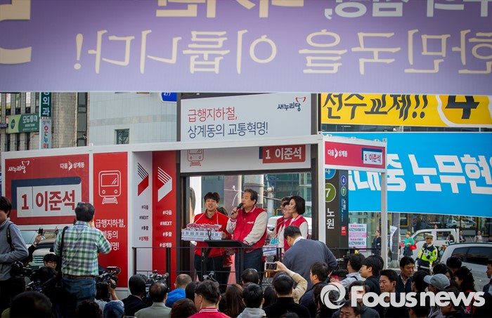 (서울=포커스뉴스) 7일 오후 서울 노원구 롯데백화점 인근에서 이준석 새누리당 노원구병 후보 지원유세에 나선 김무성 대표가 유권자들의 지지를 호소하고 있다.