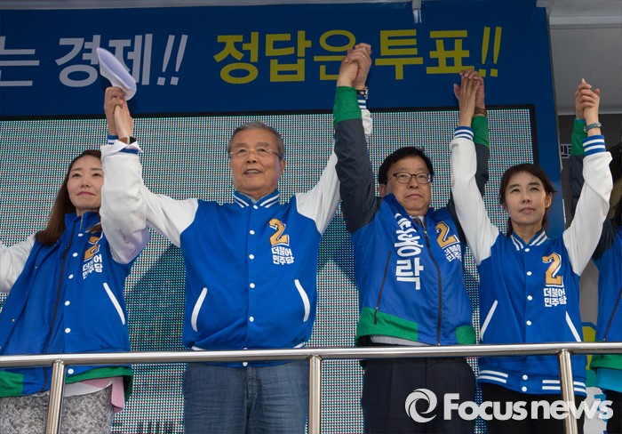 (충주=포커스뉴스) 김종민 더불어민주당 대표가 7일 오후 충북 충주 중앙로에서 윤홍락 후보의 지지를 호소하고 있다.