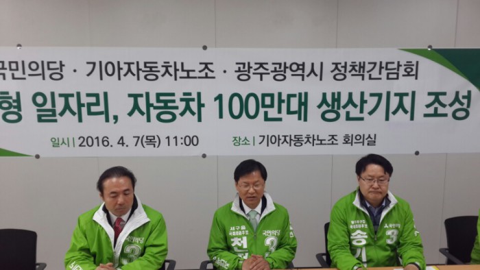 한편 이날 간담회에는 천정배 후보를 비롯해 송기석 국민의당 서구갑 후보, 광주시에서는 박병규 사회통합추진단장, 기아차 노조에서는 박주기 지회장, 김승철 협력부지회장, 윤육용 정책실장이 참석했다.7일 광주 자동차 100만대 생산기지 조성 정책간담회에참석한 국민의당 천정배·송기석 후보 <사진출처= 국민의당 광주시당 제공>