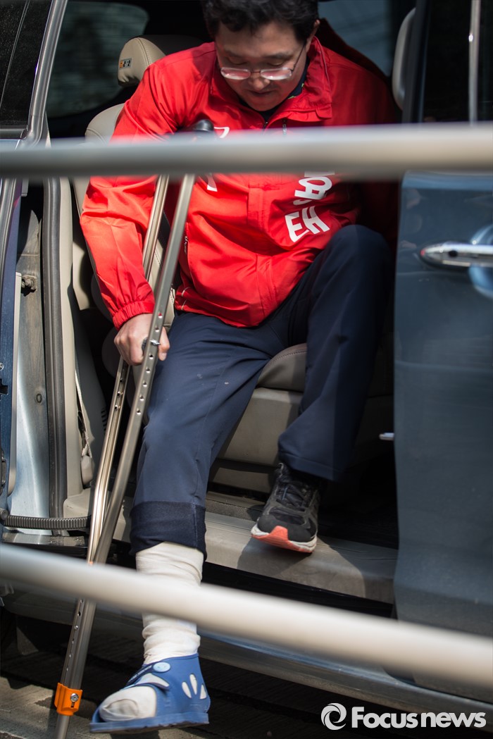 (서울=포커스뉴스) 김용태 새누리당 양천구을 후보가 7일 오후 서울 양천구 신월동 일대에서 깁스한 다리로 선거운동을 하고 있다.