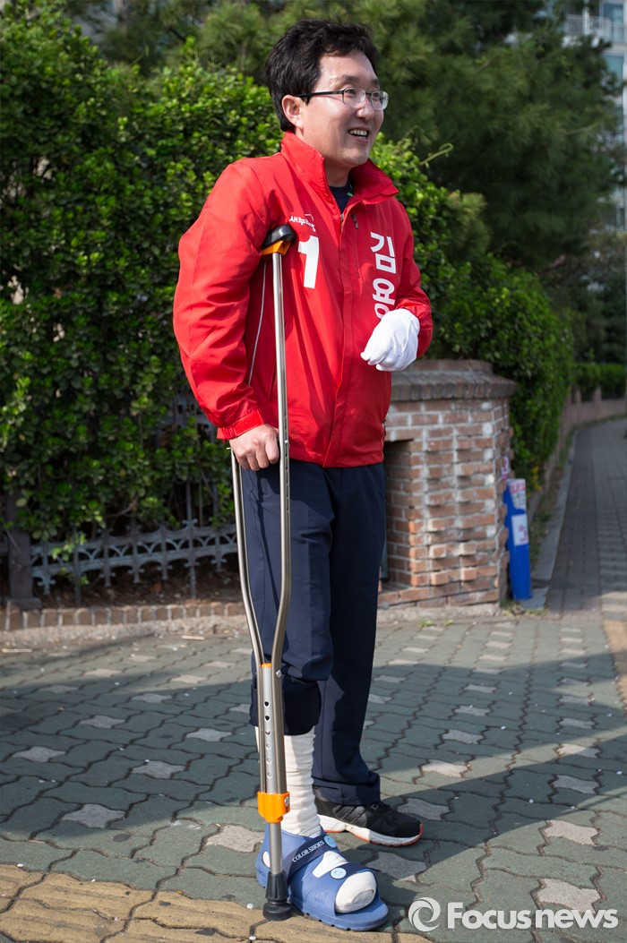 (서울=포커스뉴스) 김용태 새누리당 양천구을 후보가 7일 오후 서울 양천구 신월동 일대에서 깁스한 다리로 선거운동을 하고 있다.