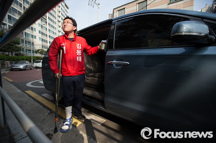 (서울=포커스뉴스) 김용태 새누리당 양천구을 후보가 7일 오후 서울 양천구 신월동 일대에서 깁스한 다리로 선거운동을 하고 있다.