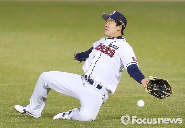 (서울=포커스뉴스) 7일 서울 잠실구장에서 열린 2016 프로야구 NC-두산 경기 3회 1사 2,3루에서 두산 우익수 민병헌이 NC 손시헌의 타구를 슬라이딩하며 잡으려 시도하고 있다.
