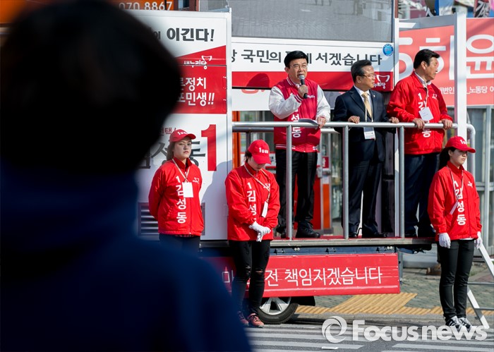 (서울=포커스뉴스) 20대 총선에 출마하는 김성동 새누리당 서울 마포을 후보의 선거운동원들이 7일 오후 서울 경성고등학교 앞 사거리에서 선거유세를 하고 있다.