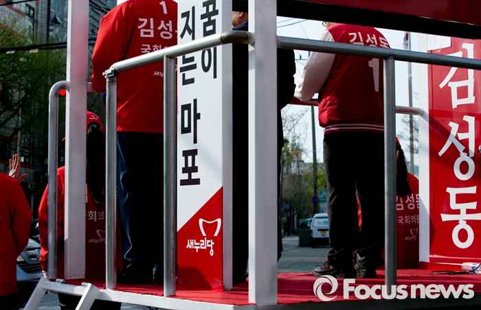(서울=포커스뉴스) 20대 총선에 출마하는 김성동(가운데) 새누리당 서울 마포을 후보의 선거운동원들이 7일 오후 서울 경성고등학교 앞 사거리에서 선거유세를 하고 있다.