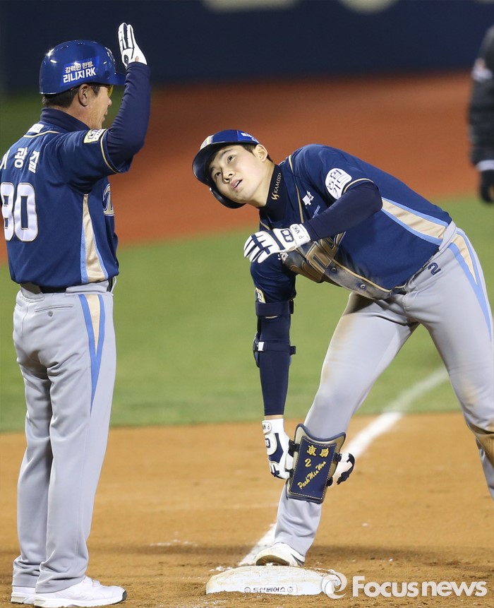 (서울=포커스뉴스) 7일 서울 잠실구장에서 열린 2016 프로야구 NC-두산 경기 5회초 2사 1,2루에서 NC 박민우가 2타점 좌중간 3루타를 치고 3루에서 이광길 코치를 보고 있다.