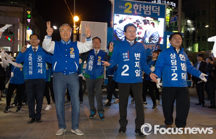 (청주=포커스뉴스) 김종민 더불어민주당 대표가 7일 오후 충북 청주 상당구 성안길에서 율동을 하며 청주시 후보에 대한 지지를 호소하고 있다.