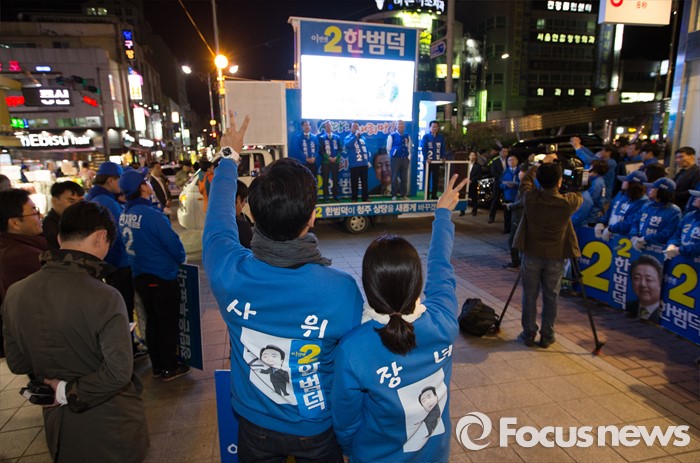 (청주=포커스뉴스) 7일 오후 충북 청주 상당구 성안길에서 김종인 더불어민주당 대표가 지원유세를 나온 가운데 한범덕 후보의 장녀와 사위가 지지를 호소하고 있다.