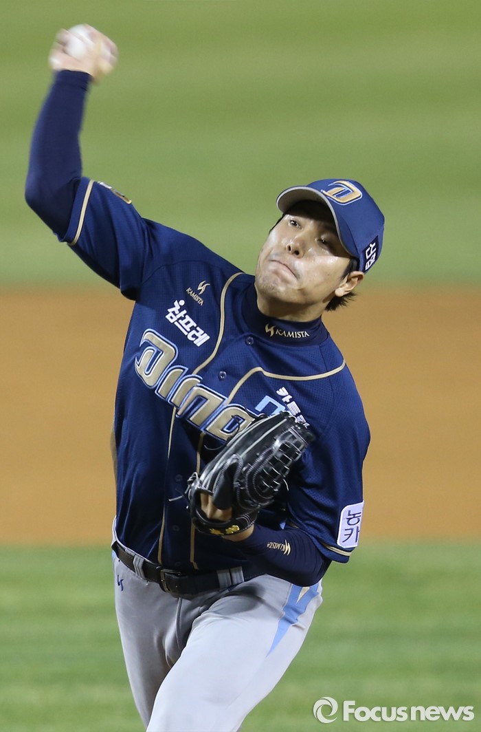 (서울=포커스뉴스) 7일 서울 잠실구장에서 열린 2016 프로야구 NC-두산 경기에서 NC 투수 김진성이 9회 등판해 투구하고 있다.