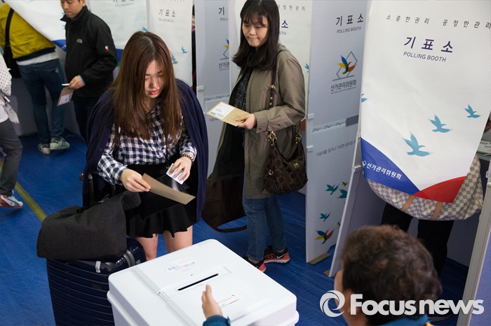 (인천공항=포커스뉴스) 제20대 국회의원 선거 사전투표 시작일인 8일 오전 인천국제공항 출국장에서 유권자들이 사전투표를 하고 있다.
