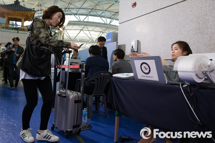 (인천공항=포커스뉴스) 제20대 국회의원 선거 사전투표 시작일인 8일 오전 인천국제공항 출국장에서 한 유권자가 투표용지를 받기 위해 신원확인을 하고 있다.