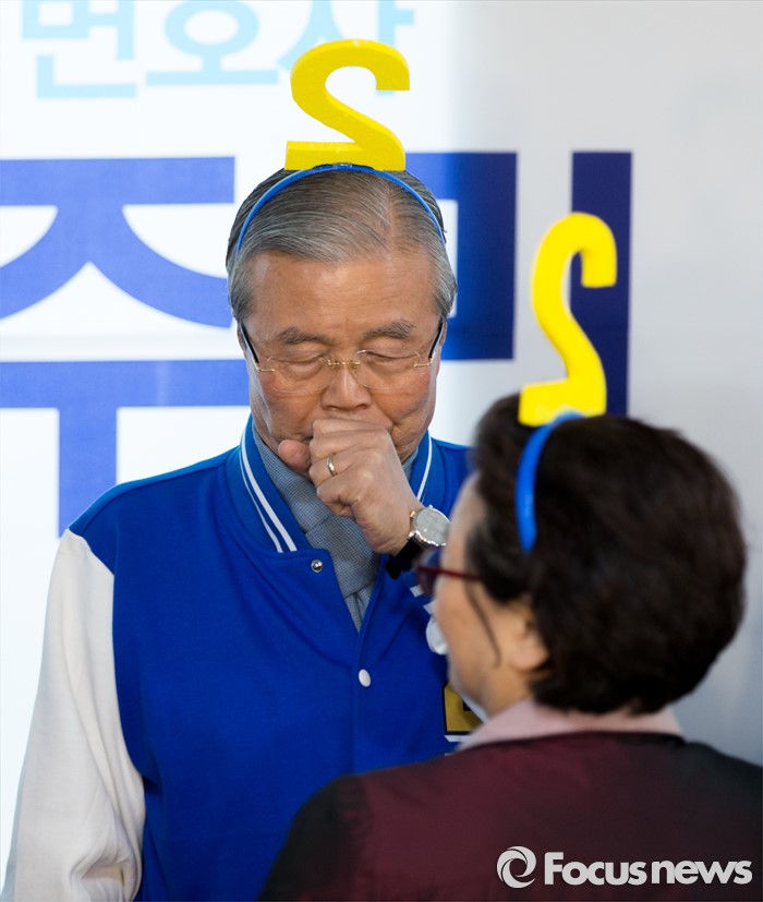 (서울=포커스뉴스) 김종인 더불어민주당 비대위 대표 겸 선대위원장이 8일 오전 서울 은평구 응암로 박주민 은평구갑 후보 사무실에서 중앙선거대책위원회 회의 전 2번 머리띠를 착용하고 지역 어르신들과 기초노령연금인상 공약 퍼포먼스를 하고 있다.