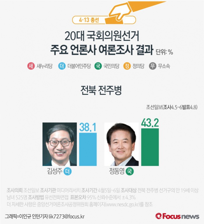 (서울=포커스뉴스) 조선일보가 여론조사기관 미디어리서치에 의뢰해 8일 발표한 결과에 따르면 전북 전주병에서 더불어민주당 김성주 후보의 지지율은 38.1%, 국민의당 정동영 후보의 지지율은 43.2%인 것으로 나타났다.