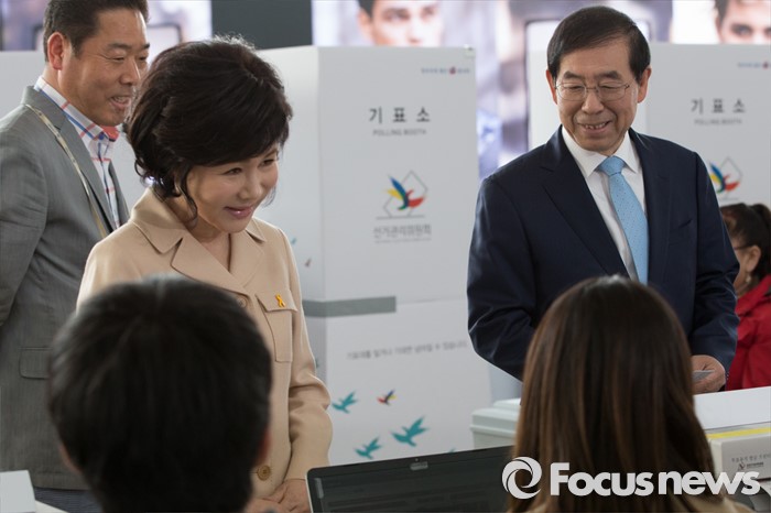 (서울=포커스뉴스) 4.13총선을 닷새 앞둔 8일 오전 서울 용산구 서울역에 설치된 남영동 사전투표소에서박원순 서울시장과 부인 강난희씨가 투표를 하고 있다.
