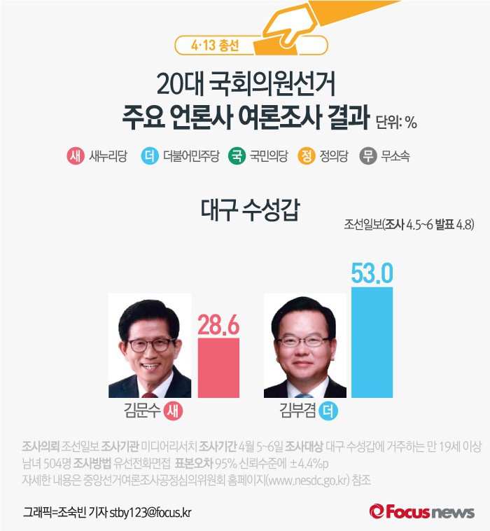 (서울=포커스뉴스) 조선일보가 여론조사기관 미디어리서치에 의뢰해 8일 발표한 결과에 따르면 대구 수성갑에서 새누리당 김문수 후보의 지지율은 28.6%, 더불어민주당 김부겸 후보의 지지율은 53.0%인 것으로 나타났다.