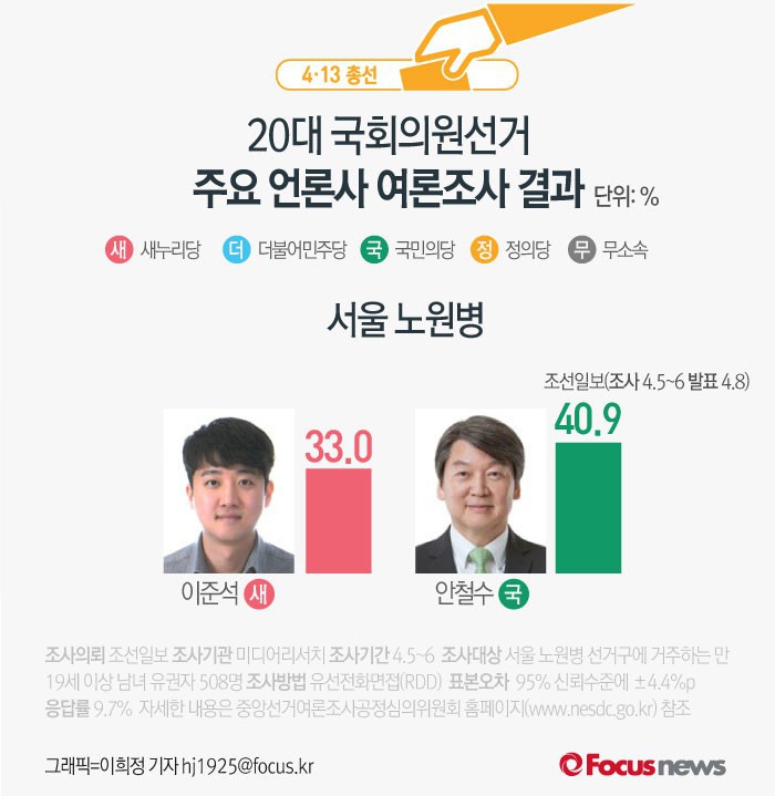 (서울=포커스뉴스) 조선일보가 미디어리서치에 의뢰해 5~6일 실시한 서울 노원병 여론조사 결과에 따르면 새누리당 이준석 후보의 지지율은 33.0%, 국민의당 안철수 후보의 지지율은 40.9%로 나타났다.