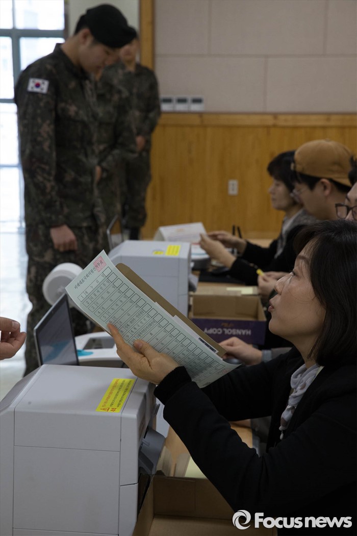 (고양=포커스뉴스) 20대 총선 사전투표가 시작된 8일 오전 고양시 일산동구 식사동 주민센터에 마련된 사전투표소에서 군인장병들이 투표하고 있다.