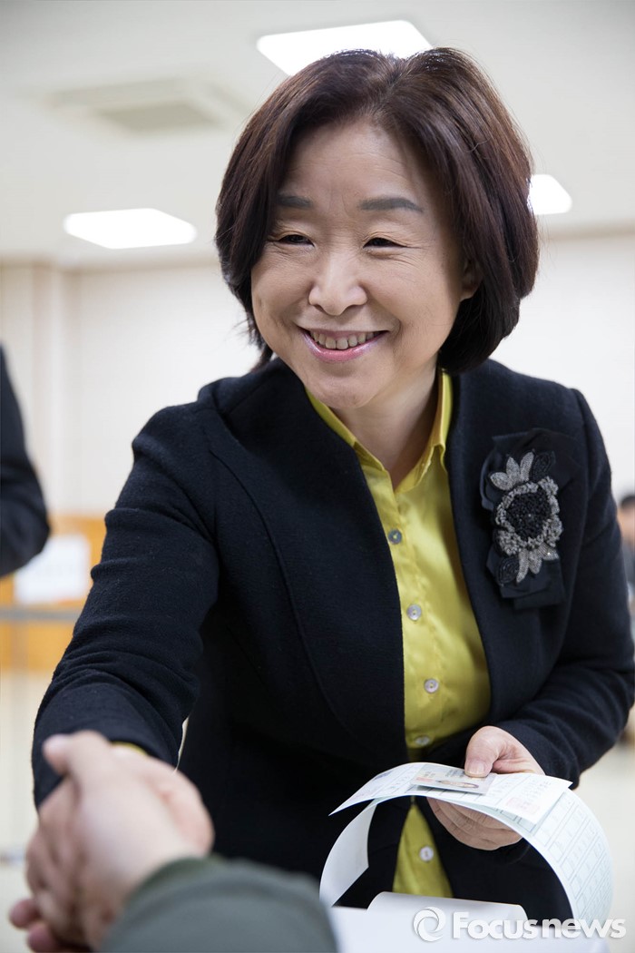 (고양=포커스뉴스) 20대 총선 사전투표가 시작된 8일 오전 심상정 정의당 고양갑 후보가 고양시 일산동구 식사동 주민센터에 마련된 사전투표소를 찾아 직원들과 인사하고 있다.