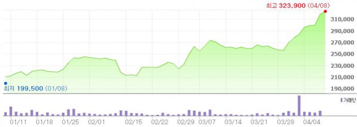 이에 따라 휴젤에 대한 목표주가를 종전 30만원에서 40만원으로 상향 조정했다.최근 3개월간 휴젤 주가 추이 <그래픽출처=네이버>