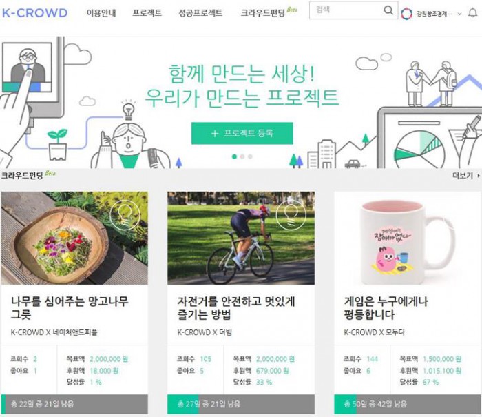 한편, 현재 크라우드 소싱 플랫폼 K-CROWD는 친환경 소셜벤처 '비틀에코', 장애인 소셜벤처 '모두다' 등 다양한 분야의 사회적 기업들에 대한 크라우드 펀딩을 진행한 바 있다.네이버-강원창조경제혁신센터 K-CROWD 펀딩