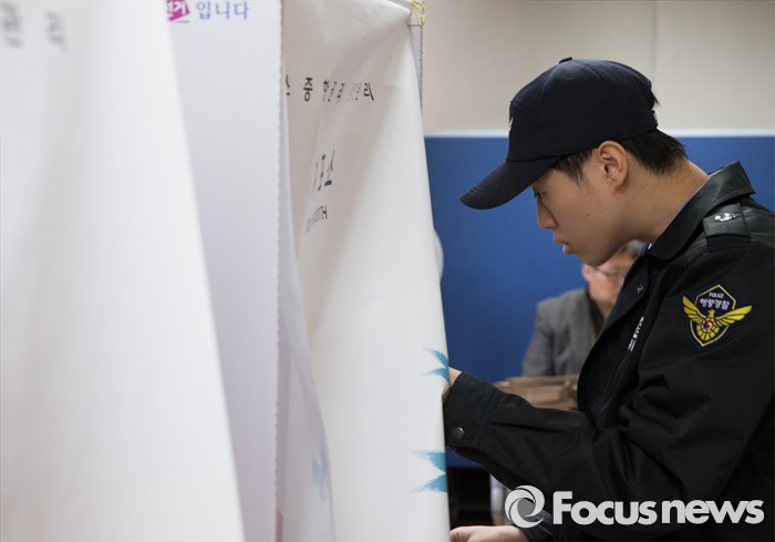 (인천=포커스뉴스) 제20대 국회의원 선거 사전투표 시작일인 8일 오전 인천 연수구 송도1동 주민센터에서 인천 중부해양경비안전본부 소속 해경이 사전투표를 하고 있다.