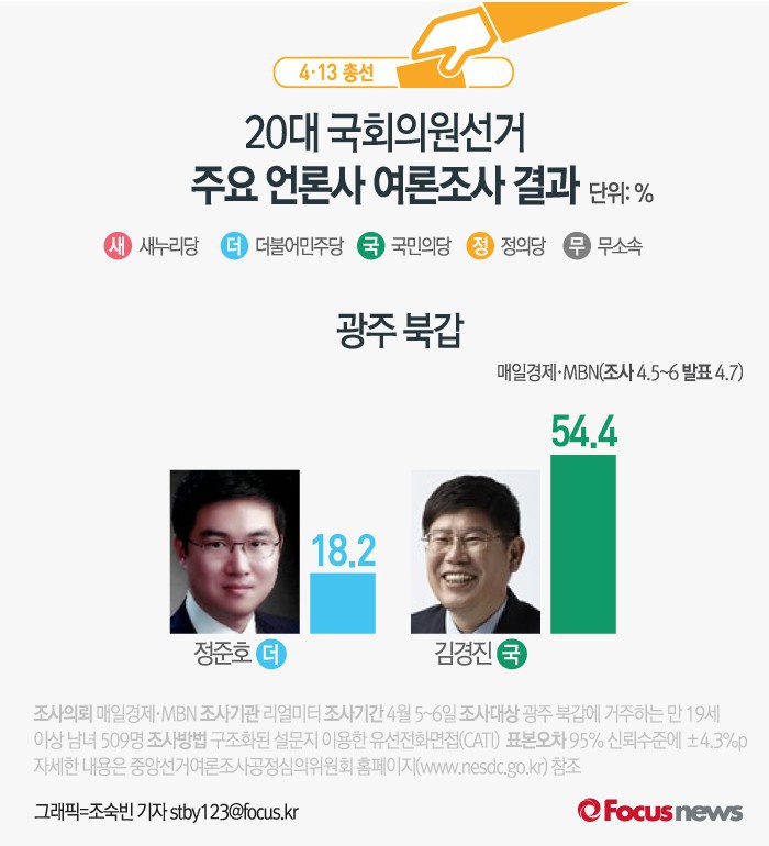 (서울=포커스뉴스) 매일경제와 MBN이 여론조사기관 리얼미터에 의뢰해 7일 발표한 결과에 따르면 광주 북갑에서 더민주 정준호 후보의 지지율은 18.2%, 국민의당 김경진 후보의 지지율은 54.4%인 것으로 나타났다.