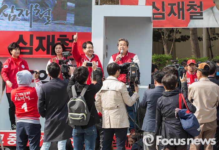 (안양=포커스뉴스) 8일 오전 경기 안양시 범계역 인근에서 심재철 새누리당 안양동을 후보 지원유세에 나선 김무성 대표가 유권자들의 지지를 호소하고 있다.