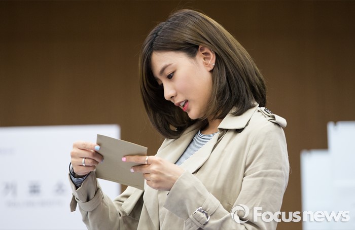 △ 투표용지 살펴보는 에이핑크 오하영