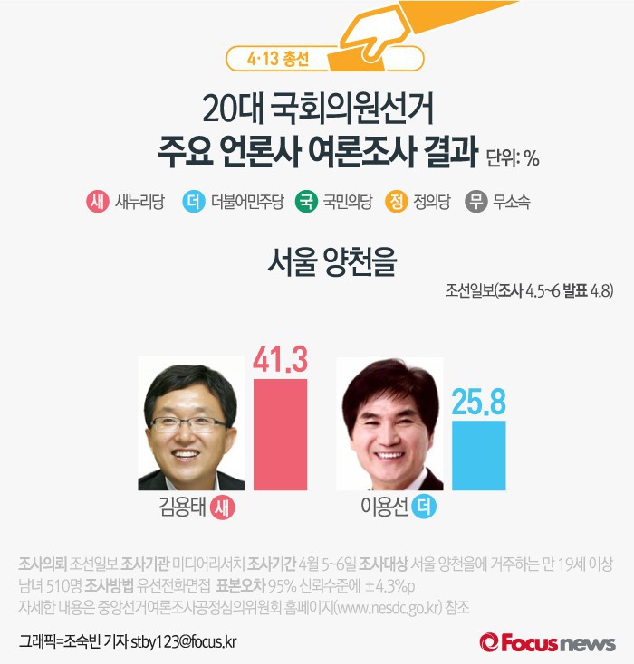 (서울=포커스뉴스) 4·13 총선을 5일 남겨둔 가운데 서울 양천을에 출마한 김용태 새누리당 후보가 이용선 더불어민주당 후보에 오차범위 밖에서 우세한 것으로 나타났다.