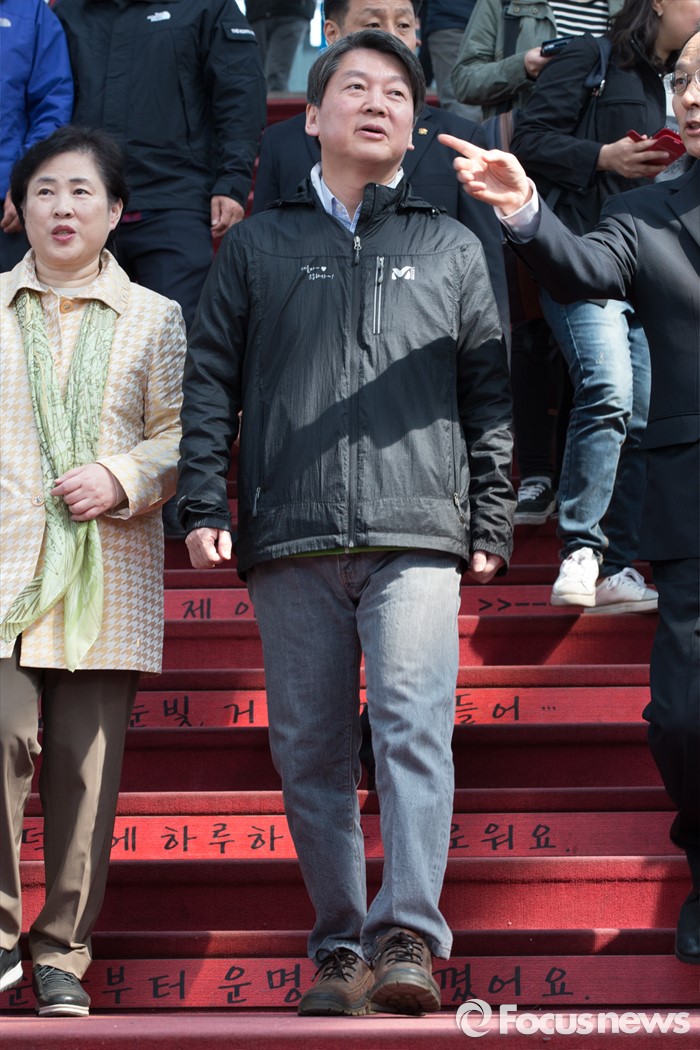 (서울=포커스뉴스) 4.13총선 사전투표 첫째날인 8일 오전 서울 용산구 서울역에서 안철수 국민의당 상임공동대표가 사전투표 격려 후 대전으로 가는 KTX를 타기위해 계단을 내려오고 있다.